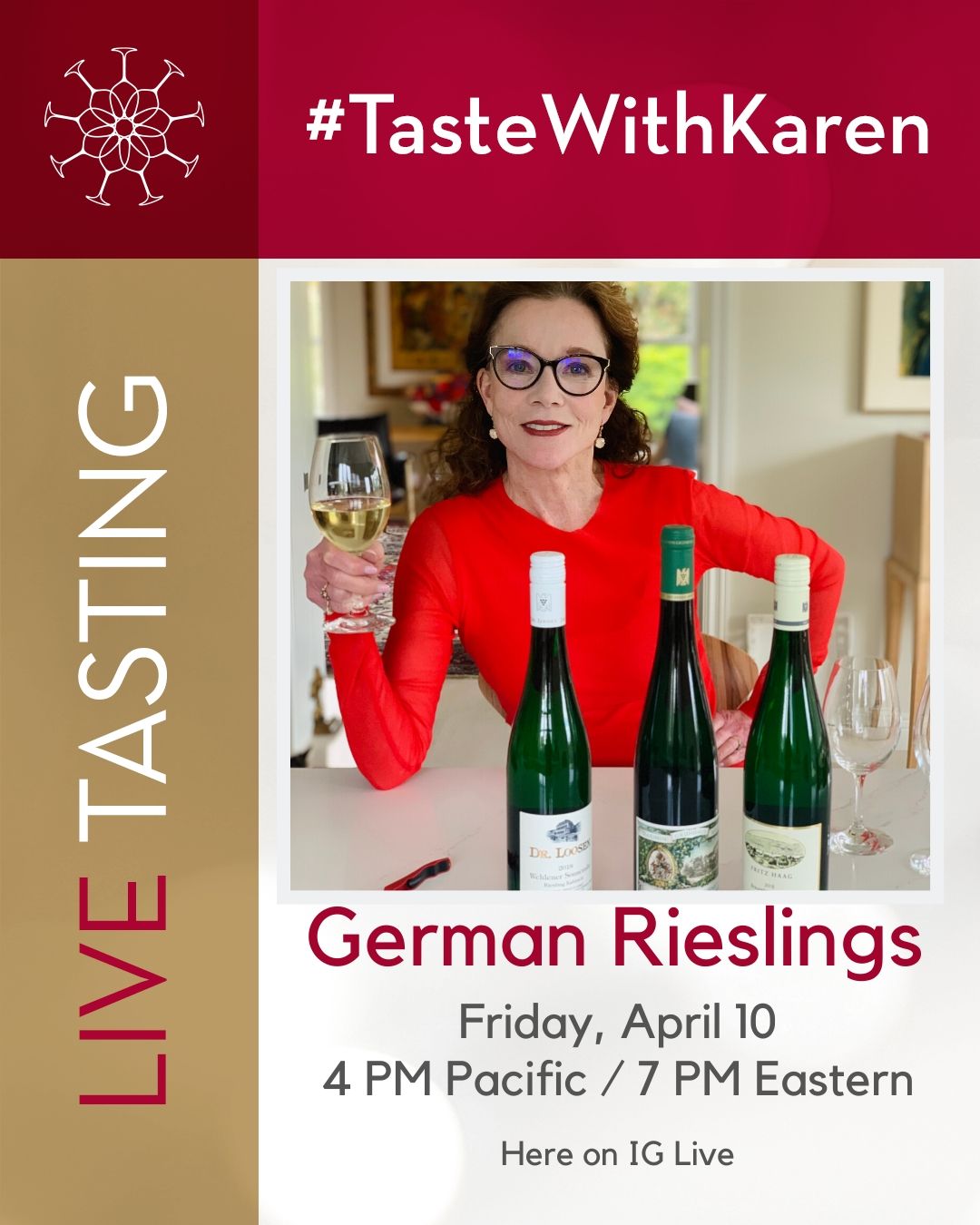 Join renowned wine writer Karen MacNeil on her Instagram channel @karenmacneilco on Friday April 10, 2020 at 4pm PT/7pm ET and sip along with some delightful German Riesling! Karen, author and founder of the Wine Speed blog, will be pouring some of her favorite German Rieslings as she highlights qualities of Riesling that make it the noblest of white grape variety.